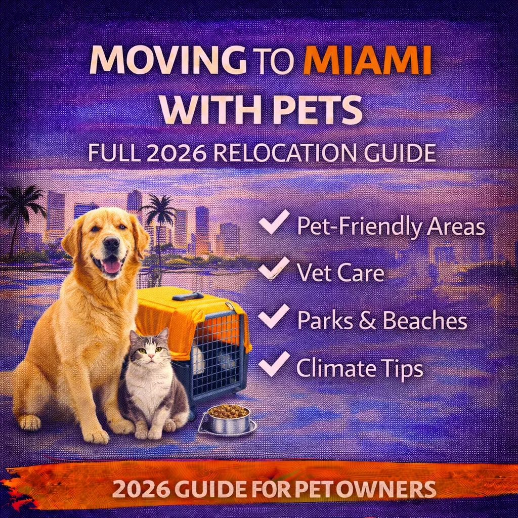 Relocating to Miami with pets? This 2026 guide covers pet‑friendly neighborhoods, vet care, parks, climate considerations, and essential tips for moving to Miami with dogs, cats, and more.